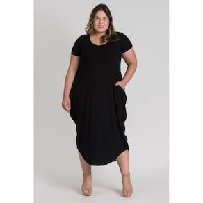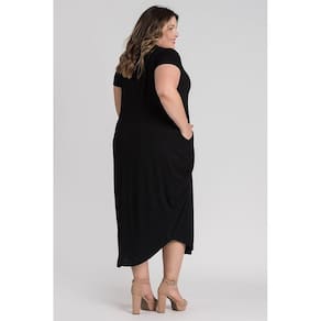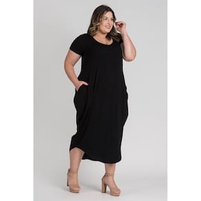 Vestido feminino plus size elaborado em visco. Possui boa elasticidade, peça leve, macia, com bolsos nas laterais, barra em formato oval e decote "V". Peça cheia de estilo e conforto. Monte look arrasadores estando bem vestida!