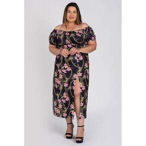 Vestido Feminino Plus Size Longo Ciganinha Malha Confort Estampado Fenda Frontal - Serena - Preto - G3