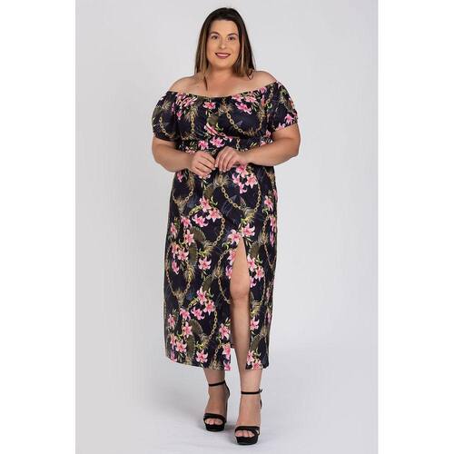 Vestido Feminino Plus Size Longo Ciganinha Malha Confort Estampado Fenda Frontal - Serena Preto - G4 - Vestido Feminino Plus Size Longo Ciganinha EstampasdoMalha Confort Detalhe Cintura Fenda Frontal - Serena