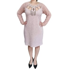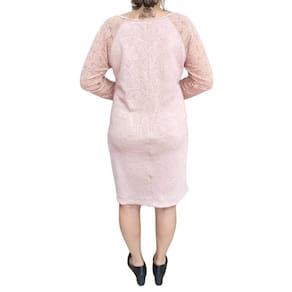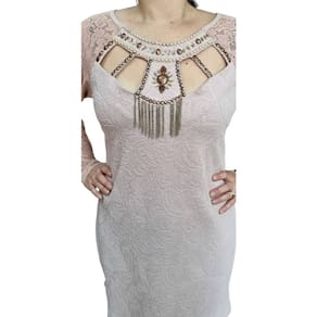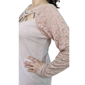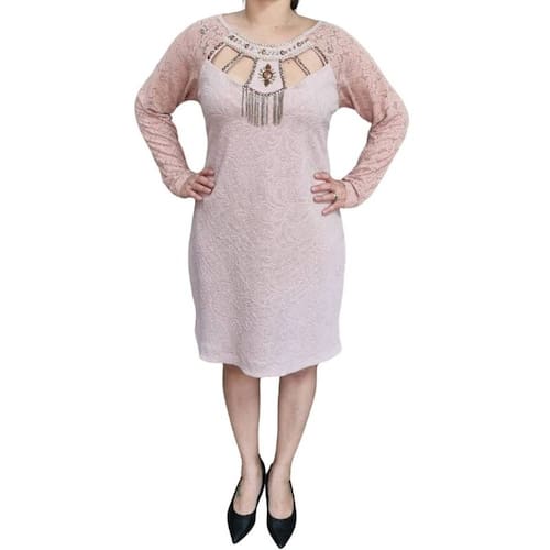 Vestido Festa CKM Rendas e Pedrarias Manga Longa Rosê Plus Size.