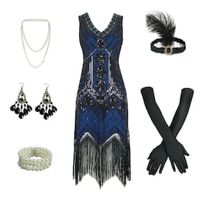 BONGZUO Vestido feminino estilo melindrosa anos 20, vintage, renda com franjas, Gatsby, conjunto de acessórios dos anos 20 (Z3722BU, GG)