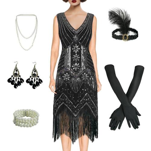 - O pacote inclui: 1 par de luvas longas pretas; 1 par de brincos; 1 colar de pérola; 1 faixa de cabeça melindrosa; 1 pulseira de pérola artificial; 1 peça de vestido de festa gatsby
