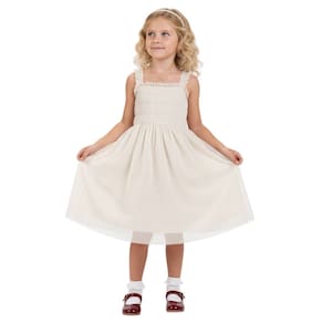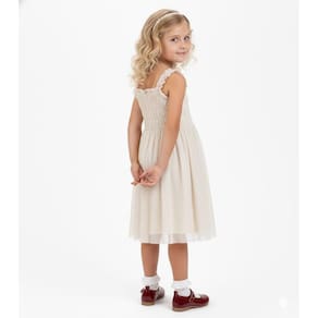 Vestido infantil confeccionado em tule shine com forro macio, oferecendo leveza, brilho delicado e muito conforto.