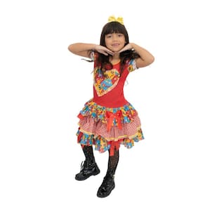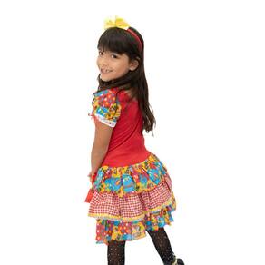 A saia rodada em camadas é composta por tecido vermelho quadriculado e estampas de bandeirinhas, adicionando um toque vibrante e tradicional ao visual. Além disso, o vestido é adornado com lindos laços em cetim, fixos pelo vestido.