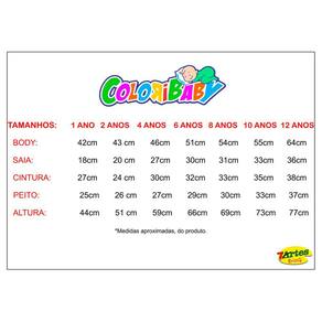 TAMANHOS: 1 ANO 2 ANOS 4 ANOS 6 ANOS 8 ANOS 10 ANOS 12 ANOS BODY: 42cm 43 cm 46cm 51cm 54cm 55cm 64cm SAIA: 18cm 20 cm 27cm 30cm 31cm 33cm 36cm CINTURA: 27cm 24 cm 30cm 32cm 33cm 35cm 38cm PEITO: 25cm 26 cm 27cm 29cm 30cm 33cm 37cm ALTURA 44cm 51 cm 59cm 66cm 69cm 73cm 77cm *Medidas aproximadas, do produto.
