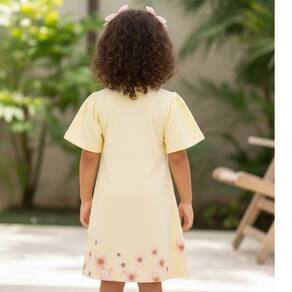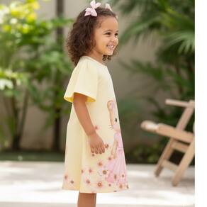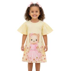 Vestido Infantil Amarelo com estampa de gatinha vestida de rosa, delicada e charmosa, perfeita para deixar o visual das meninas ainda mais alegre. O modelo conta com mangas borboleta amplas, que trazem leveza e sofisticação à peça.