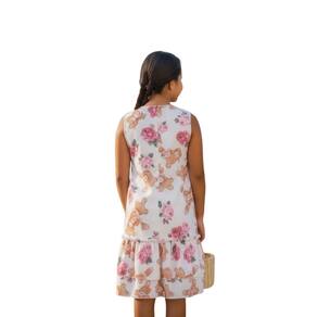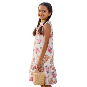 Vestido Infantil com estampa delicada de ursinhos e rosas, ideal para ocasiões especiais ou passeios cheios de charme. O modelo sem mangas oferece frescor para dias quentes e conta com babado na barra que adiciona movimento ao look.