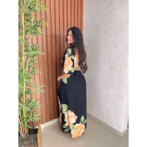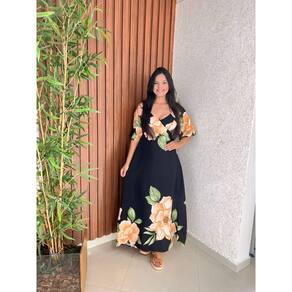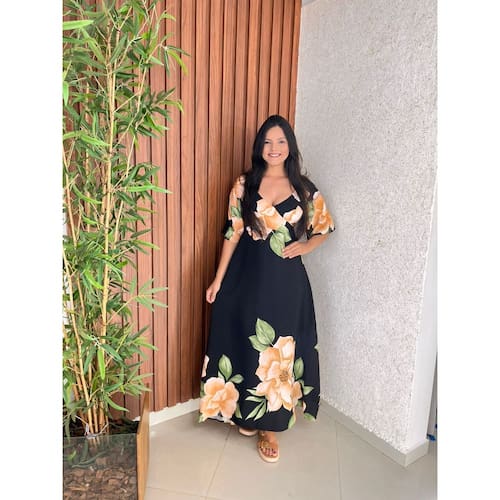 O vestido da imagem é um modelo longo, preto, com uma estampa floral marcante em tons de amarelo e verde. A peça conta com as seguintes características: