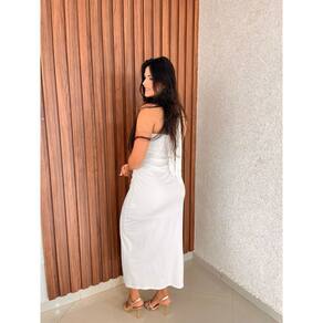 O vestido é de comprimento midi, terminando logo abaixo dos joelhos. Ele apresenta um design frente única, com alças que se prendem atrás do pescoço, deixando os ombros e parte superior das costas em evidência. A modelagem é ajustada na parte superior e na cintura, com um elegante drapeado na cintura que valoriza a silhueta. O caimento é fluido após a cintura, descendo suavemente até a bainha. O tecido leve, como malha com elastano, o que contribui para o movimento e ajuste confortável da peça. Marca: Não Informado