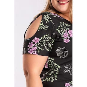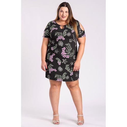 Vestido em malha viscose estampada com flores e folhas, com argola formando um lindo detalhe no decote, ombros vazado. Malha com elastano proporcionado mais conforto e ajustando ao corpo. Modelo ideal para todas as ocasiões.