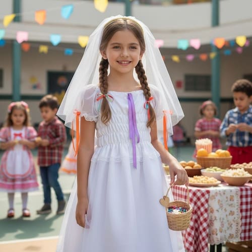 Encante a todos com o Vestido de Noivinha Infantil para Festa Junina com Véu, perfeito para deixar sua pequena ainda mais especial nas festas de São João. Com um design delicado e cheio de charme, o vestido conta com detalhes em renda e fitas coloridas, trazendo o equilíbrio ideal entre romantismo e tradição. O véu completa o visual, deixando a fantasia ainda mais encantadora e temática. Produzido com materiais de qualidade, oferece conforto e leveza, permitindo que a criança aproveite a festa com liberdade e alegria. Ideal para quadrilhas, festas escolares, apresentações e eventos juninos. Uma escolha perfeita para criar memórias inesquecíveis e garantir um visual encantador na festa junina.