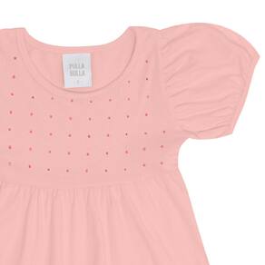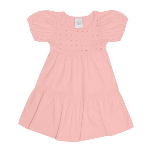 Deixe o dia a dia da sua pequena ainda mais prático e confortável! O vestido confeccionado em meia malha na cor rosê, possuí mangas curtas com elástico nas barras com pregas dando efeito bufante e decote arredondado. O detalhe de strass na parte frontal deixa a peça ainda mais fofa. Ideal para os dias mais quentes da estação Primavera Verão, podendo deixar o passeio ainda mais fashionista.