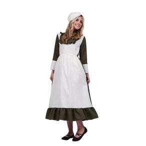 Emeline Colonial Camponês Olive Zíper, Vestido de manga comprida com anexado fora avental branco, gorro.
