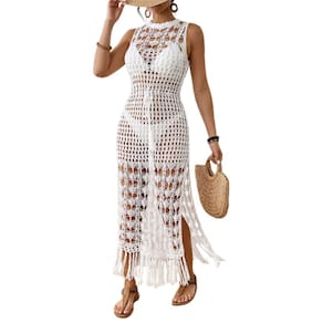 Arrase na praia ou na piscina com este vestido saída de praia longo em crochê. Disponível nas cores branco e preto, ele traz um design sofisticado, com recortes vazados que deixam o look moderno e sensual. O modelo sem mangas valoriza os ombros, enquanto a fenda lateral e as franjas na barra adicionam movimento e estilo. Leve e arejado, é perfeito para sobrepor ao biquíni ou maiô, garantindo conforto e elegância nos dias de sol.