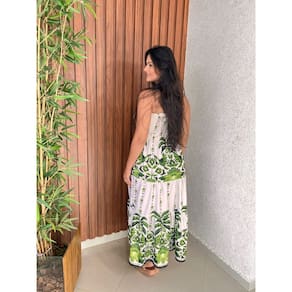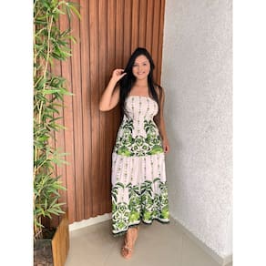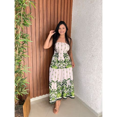 O vestido é longo, tomara que caia, com um design fluido e feminino. Possui fundo claro, em tom de branco ou bege suave, e é ricamente estampado com padrões florais e folhagens, com detalhes que contornam os desenhos. A estampa é distribuída em faixas horizontais ao longo do vestido, criando um visual harmonioso e tropical. O modelo tem um caimento leve, ideal para climas quentes, transmitindo frescor e elegância com um toque natural e sofisticado. Marca: Não Informado