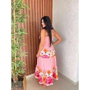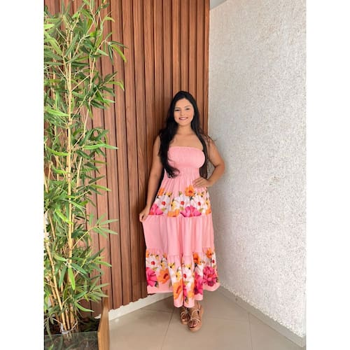 O vestido é longo, tomara que caia, com um design fluido e feminino. Possui fundo claro, em tom de branco ou bege suave, e é ricamente estampado com padrões florais e folhagens, com detalhes que contornam os desenhos. A estampa é distribuída em faixas horizontais ao longo do vestido, criando um visual harmonioso e tropical. O modelo tem um caimento leve, ideal para climas quentes, transmitindo frescor e elegância com um toque natural e sofisticado. Marca: Não Informado