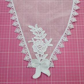 Confeccionado Tule Poá (100 poliéster) e Renda Guipir (100% poliéster).