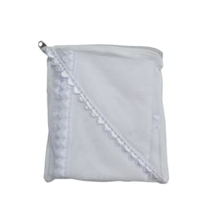 Confeccionado com Filó Verona (75% algodão e 25% poliéster) e Renda Guipir (100% poliéster).