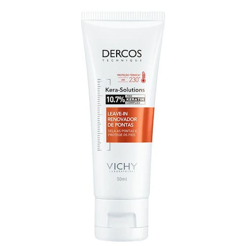 Leave-in para cabelos danificados por químicas ou agressões térmicas. Leave-in Vichy Dercos Kera-Solutions repara as pontas e sela as cutículas, além de promover proteção térmica de até 230º.