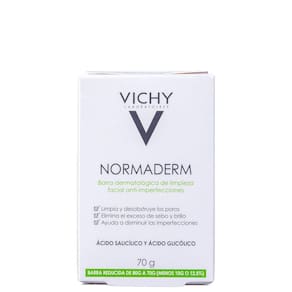 Sabonete em barra para pele oleosa a acneica. Vichy Normaderm Sabonete Dermatológico promove limpeza profunda, sem ressecar e repuxar a pele.