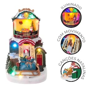 Este item encantador combina cenário tridimensional da fábrica brinquedos, neve, partes móveis que simulam os brinquedos caindo no saco de presentes e luz encantadora que tornam qualquer ambiente mais aconchegante e festivo. Com música natalina e um design sofisticado, este Cenário Vila Natalina Musical Natal Iluminado com Movimento é o toque perfeito para criar uma atmosfera alegre durante as festas de fim de ano.