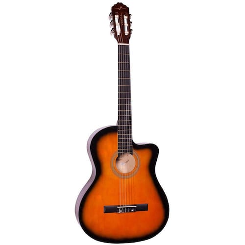 Violão Clássico Acústico Vogga Nylon Vca206 Nc Sunburst ESPECIFICAÇÕES TÉCNICAS Violão Clássico acústico com cutaway Tamanho: 39" 4/4 99 cm Tampo faixas e fundo em Linden Escala e cavalete em Dark Maple Tensor Bi-direcional Filetes ABS Tarraxas niqueladas com madrepérola Cores: Sunburst YS Ean: 7898477682606