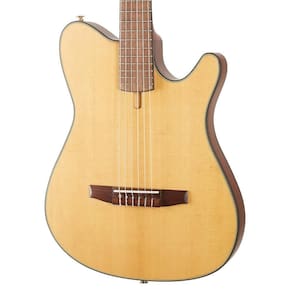 Violão Elétrico Ibanez FRH10N-NTF Flat Nylon Tampo Sólido Os violões eletroacústicos clássicos Ibanez FRH combinam o som das cordas de nylon com a tocabilidade das guitarras elétricas. Possui um corpo compacto e estreito com um orifício de som lateral, um recorte inferior para facilitar o acesso até mesmo às posições mais altas da escala, um nut mais estreito 46 mm e um raio de escala mais plano. A ausência de um orifício de som na caixa de ressonância torna o violão muito menos suscetível ao efeito de feedback da ressonância, que muitas vezes é indesejável.
