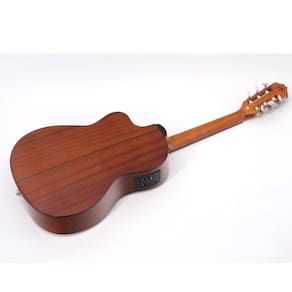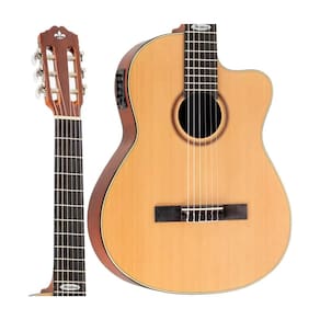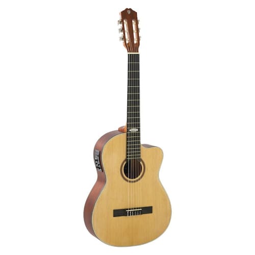 Violao classico eletroacustico, com corpo em formato cutaway (recorte) para facilitar acesso as casas mais agudas. Ideal para iniciantes e uso em pequenos palcos, com captacao para amplificacao e acabamento em visual natural.