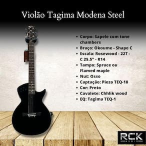 Características: Violão Tagima Modena 1 Aço Preto Corpo: Sapele com tone chambers Braço: Okoume - Shape C Escala: Rosewood - 22T - C 25.5 - R14 Tampo: Spruce ou Flamed maple Nut: Osso Captação: Piezo TEQ-10 Cor: Preto Cavalete: Chhlik wood EQ: Tagima TEQ-1 Marca: Não Informado Ean: 7898651941192