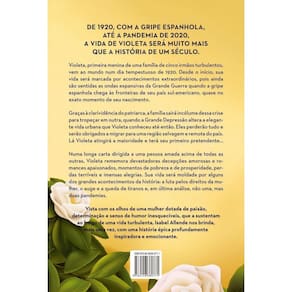 Isabel Allende, autora best-seller do New York Times, apresenta neste romance arrebatador a épica história da centenária Violeta Del Valle, uma mulher que testemunhou toda a efervescência do século XX. Violeta veio ao mundo em um dia tempestuoso de 1920, a primeira menina em uma família com cinco filhos. Desde o início, sua vida foi marcada por acontecimentos extraordinários: ainda era possível sentir os efeitos da Grande Guerra quando a gripe espanhola chegou ao seu país, pouco antes do seu nascimento.A família saiu ilesa dessa crise, mas não conseguiu enfrentar a seguinte. A Grande Depressão transformou totalmente a vida urbana que Violeta conhecia. Sua família perdeu tudo e foi forçada a se mudar para uma parte mais remota do país. Lá, ela cresceu e terá seu primeiro pretendente.Violeta narra sua história em uma carta a pessoa que mais ama nessa vida, contando decepções e casos amorosos, momentos de pobreza e riqueza, terríveis perdas e imensas alegrias, sempre permeando grandes eventos da história: a luta pelos direitos das mulheres, a ascensão e queda de tiranos e, em última análise, não uma, mas duas pandemias.Contada pelos olhos de uma mulher apaixonada, determinada e com senso de humor, Isabel Allende – autora de A casa dos espíritos, Muito além do inverno, Longa pétala de mar, entre outros – nos conduz por uma vida turbulenta na forma de um romance épico, inspirador e profundamente emocionante.