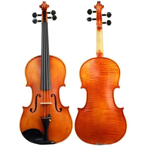 Violino semi-profissional feito em oficina, com madeiras maciças melhores selecionadas e montagens em ébano. Excelente custo-benefício para músicos exigentes. Todos os ajustes feitos pelo luthier na alma, pestana, cravelhas e cavalete, são todos refinados e permitem ao músico, ao receber o instrumento, já tocar com facilidade.