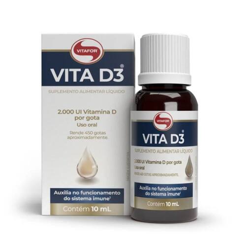 Benefícios do Vita D3 (10ml) – Vitafor: Contribui para a saúde e fortalecimento dos ossos e dentes.Auxilia na absorção e fixação do cálcio no organismo.Suporte essencial para o sistema imunológico.Favorece o equilíbrio hormonal e o bom funcionamento do metabolismo.Pode ajudar no desempenho e recuperação muscular.Suporte à saúde cardiovascular.Fórmula em gotas com alta biodisponibilidade e absorção.Sugestão de uso: