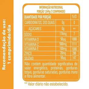 Suplemento alimentar de Vitamina D3 em comprimidos revestidos. Possui 2.000UI de Vitamina D que auxilia no funcionamento do sistema imune e muscular. Indicado como suplemento vítaminico em dietas restritivas e inadequedas. Com vitamina C, selênio e Zinco. Modo de usar: 1 comprimido ao dia ou de acordo com recomendação do médico e/ou nutricionista.