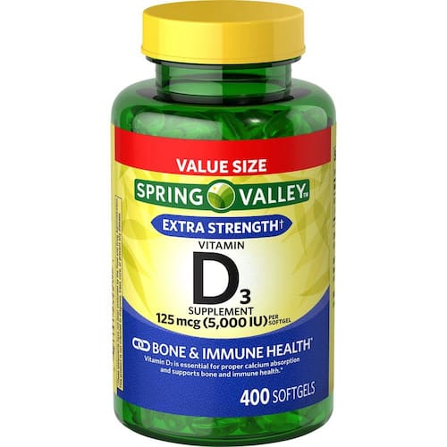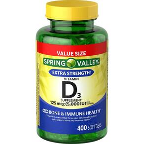 Esses suplementos de vitamina D são sem glúten, sem laticínios e não-OGM. As vitaminas Spring Valley D3 não contêm cores ou sabores artificiais. Spring Valley entende que viver um estilo de vida saudável e equilibrado é a chave para ser você mesmo. Com uma gama acessível de produtos inspirados na natureza, Spring Valley apoia a sua saúde e o bem-estar holístico da sua família. Os adultos devem tomar um suplemento de vitamina D3 de 125 mcg de gel ósseo diariamente, de preferência com as refeições.