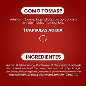 Vitamina k2 menaquinona-7 e vitamina d3 colecalciferol , azeite de oliva. Antioxidante: di alfa tocoferol. Composição da cápsula: água purificada, gelificante gelatina, umectante glicerina e corante carmim.