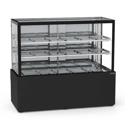 - Temperatura quente: 60C; - Controlador digital de temperatura; - Gabinete externo em aço galvanizado pintado preto; - Revestimento interno em aço inox 430; - Câmara em vidro temperado, duplo e com aquecimento; - Iluminação LED 6500k no teto e prateleiras; - Portas traseiras de bater em aço inox; - Prateleiras em vidro temperado; - Pés termoplásticos com regulagem de altura.
