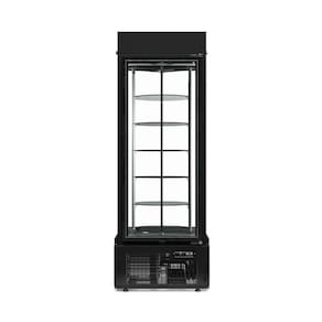 Vitrine Refrigerada Giratória Para Bolos Gelopar GEVG-075 PR-220v, da Gelopar é simplesmente fantástico quando o assunto é expor seus bolos da maneira mais chamativa e bonita possível. A Gelopar reconhece que os clientes das doceiras e confeitarias estão cada vez mais exigentes, logo criou este produto para agradá-los.Com capacidade para 6 bolos, O GEVG-075 possui 6 prateleiras de vidro 515 mm temperado com capacidade para 15kg cada, além de iluminação em LED e controlador eletrônico digital de temperatura. O acabamento interno é em aço Inox 304 na base e laterais e Aço Inox 430 no teto, o acabamento externo é em vidro com detalhes estruturais em aço pré-pintado Preto. Os vidros são duplos e possuem gás argônio que reduz a condensação entre os vidros.. Sistema giratório com parada na abertura, que promove maior destaque na exposição.
