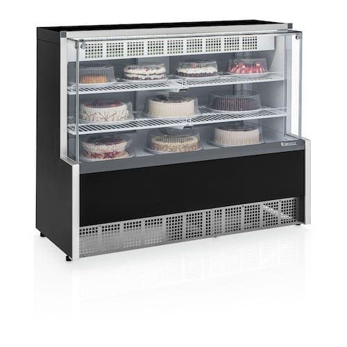 Vitrine Refrigerada Confeitaria Linha Aurora Dupla Função GPEA140R Gelopar. Vitrine Refrigerada Confeitaria Dupla Função. Conservação e Exposição de bolos, tortas, doces e confeitos. Conservação e Exposição de bebidas, frios e laticínios. Refrigeração: Estática com evaporador aletado. Temperatura: Bolos: +5C a +10C. Bebidas: 0 a +7C. Degelo: Manual. Controle de Temperatura: Termostato. Revestimento Externo: Gabinete: Monobloco em aço pré-pintado. Iluminação LED (interna), com interruptor. Porta(s) injetada(s) em PSAI. Prateleiras: 2 níveis, aramadas. Pés niveladores. Vidros temperados sujeitos a condensação da umidade do ar. Recomendável embalagem com cúpula para proteção dos bolos, pois poderá haver gotejamento da condensação da chapa do evaporador. TEMPERATURA: bolos +5°C a +7°C /bebidas 0°C a +7°C. PESO: 77 Kg. CONSUMO: 5,72 kWh/dia. DIMENSÕES EXTERNAS (CxAxL): 140x115x63,2cm. Equipamento certificado conforme Portaria Inmetro nº 371/2009. Vitrine Refrigerada Confeitaria Linha Aurora Dupla Função GPEA140R Gelopar é na Atau. Ean: 7899069641094