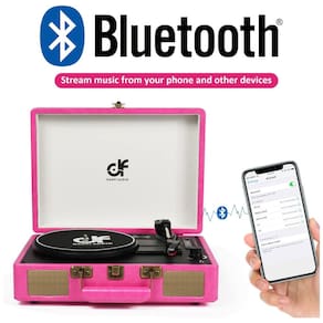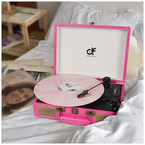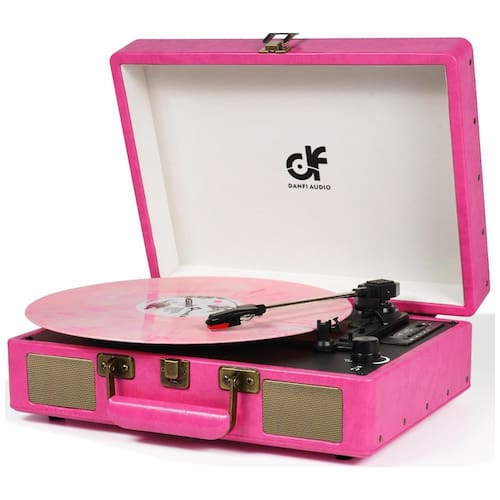 SOM PREMIUM E GRAVAÇÃO USB Este toca discos rosa possui alto falantes estéreo embutidos, você pode desfrutar de um som alto nítido em sua sala de estar, quarto ou escritório. Conecte se com seu telefone e BT transmita música sem fio em segundos. O gravador USB transferirá seus álbuns LP para arquivos de música digital e portas RCA para conectar com alto falante externo para um som mais alto. 3 VELOCIDADES E PARADA AUTOMÁTICA O toca discos de mala recém projetado 2022 gira completamente todos os seus discos com 3 velocidades ajustáveis 33 1, 3, 45, 78 rpm. um registro, sem preocupações. SISTEMA DE GIRA DISCO APRIMORADO O toca discos portátil possui um toca discos acionado por correia e quatro pés isolantes para evitar vibrações. O levantador de braço flexível pega bem a agulha e a deixa cair muito silenciosamente no disco. Sem pular. LEVE SUA MÚSICA PARA QUALQUER LUGAR Pasta estilo vintage coberta com superfície de couro PU retrô. Com alça de transporte fácil e tamanho de viagem, e seu recurso de alimentação USB DC 5V, 1A, perfeito para você levá lo para onde quiser