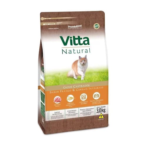 Vitta Natural Gatos Castrados Sabor Frango e Cereais IntegraisA linha Vitta Natural e formulada com proteinas de alta qualidade e enriquecida com todas as vitaminas e minerais necessarios para que os gatos vivam saudaveis e felizes. Elaborado com ingredientes naturais e cuidadosamente selecionados, o produto Vitta Natural Gatos Castrados Sabor Frango, alem de muito saboroso, nao possui corantes e aromatizantes artificiais.. Trato Urinario Saudavel. Saude intestinal. Controle do Peso