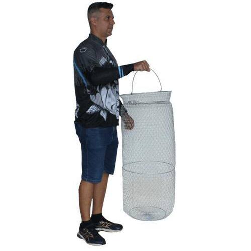 O cesto de pesca é o equipamento que não pode faltar na sua pescaria, sua estrutura de metal o torna muito mais resistente e durável, e além do mais ele conta com diversas utilidades que o tornam muito mais prático, ele possui uma alça na qual você pode deixar o cesto preso dentro da água para conservar os peixes ou então carregar o mesmo, sua estrutura é desenvolvida de modo que é possível fechar o cesto por completo, deixando-o mais prático na hora de transportar, nas suas pescarias você não vai mais passar sufoco, pois o cesto de pesca conta com uma porta com fechamento por mola que só abre para dentro ou seja, seus peixes não vão nunca mais fugir.