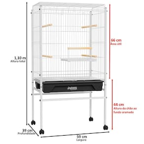 Características Principais: - Comprimento: 59 cm - Altura: 110 cm - Profundidade: 39 cm - Altura do viveiro sem os pés somente o corpo : 66 cm - Malha larga de 17mm para máxima segurança. - 4 poleiros para exercício e descanso. - 2 Comedouros plástico - Bandeja plástica removível para fácil limpeza. - Porta com poleiro para acesso fácil e diversão - Construção durável com arame BTC e pintura epóxi branca. Ideal para Diversas Espécies de Aves: Este viveiro é projetado especificamente para atender às necessidades das ring necks, calopsitas e papagaios, proporcionando-lhes um espaço seguro e acolhedor para viver e explorar. Marca: Não Informado