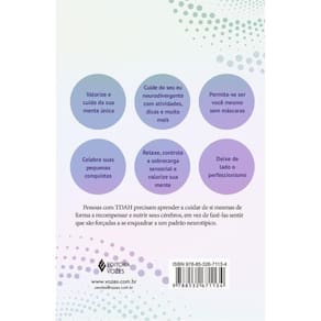 Este livro reúne mais de 100 práticas de autocuidado pensadas especialmente para quem vive com TDAH. Com linguagem acolhedora e acessível, a autora propõe estratégias que ajudam a enfrentar o cansaço, a frustração e o sobrecarregamento causados por desafios cotidianos. Ao reconhecer o potencial criativo e energético das pessoas com TDAH, ela oferece ferramentas personalizadas para recarregar as energias, desenvolver o foco e cultivar bem-estar de forma duradoura, tudo longe de abordagens convencionais e com foco na realidade de quem busca viver bem com TDAH.