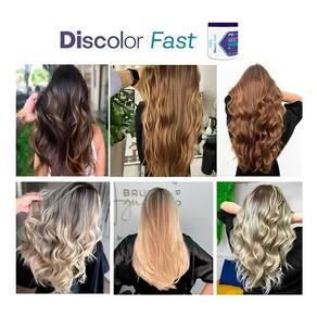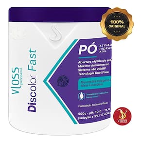 Discolor fast------ pó descolorante azul Foi desenvolvido com colágeno e óleos essenciais que protegem os fios durante oProcesso de descoloração. Possui tecnologia nano blend, o que facilita a introduçãoDe nutrientes na fibra, oferece um clareamento rápido, uniforme e de até 9 tons. SuaFragrância é suave e não levanta pó, indicado para cabelos fortes e resistentes. Tem em sua formulação enriquecida com colágeno, oque permite uma abertura de tons com muito mais segurança e proteção, além de conta com sua eficácia para abrir 9 tons com mais agilidade , mantendo a integridade do fio.Modo de uso:1- em um recipiente não metálico, misturar na proporção de 1 medida do pó para 2 medidas do ativador.2- decida o volume adequado para a técnica adequada, até obter uma consistência homogenia e cremosa.3- então aplicar a mistura com um pincel nas mechas desejadas, o tempo de ação deve ser controlado pelo profissional em função do grau de clareamento desejado.4- após o tempo de pausa, enxaguar com água morna.