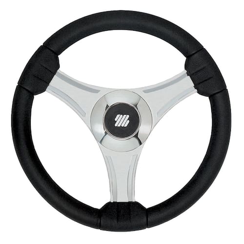 Tavolara - Volante de poliuretano preto de 13,8" com raios prateados e cubo X62 Este volante Uflex Tavolara é um volante de barco de 3 raios