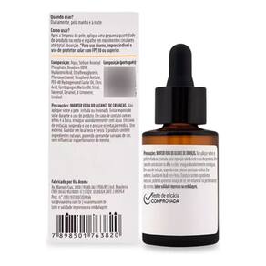 Aqua, Sodium Ascorbyl Phosphate, Disodium EDTA, Hyaluronic Acid, Ethylhexylglycerin, Phenoxyethanol, Tocopheryl Acetate, PEG-40 Hydrogenated Castor Oil, Citric Acid, Cymbopogon Martini Oil, Citral, Farnesol, Geraniol, d-Limonene, Linalool. EMBALAGEM Volumetria: 30 ml. Caixa: 10 x 9 x 9 cm. Frasco: vidro âmbar, pipeta em vidro, 9 x ø 4 cm.