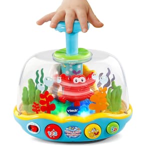 Mergulhe na diversão com o aquário learn & spin. Pressione o bico de água azul e veja-o girar, acender e tocar música. Amigos adoráveis do oceano nadam e giram no aquário enquanto as luzes piscam. Cada vez que o êmbolo é pressionado você ouvirá uma frase divertida, um som divertido ou uma melodia curta. Três botões coloridos introduzem animais, cores, números e música de reprodução. Ouça canções alegres cantadas pelo caranguejo, peixe e estrela do mar.& ; fazer um respingo com esses amigos do oceano girando!