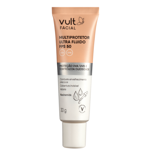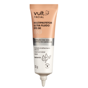 O Multiprotetor Solar Facial Vult Care FPS 50 proporciona proteção multinível (UVA + UVA logo + UVB) e 48 horas de hidratação, sem obstruir os poros nem deixar resquícios brancos. Possui textura ultra fluida com acabamento matte de cobertura invisível que não escorre, não craquela a base e nem esfarela a maquiagem. Pode ser por todos os tipos de pele, inclusive as oleosas, deixando uma sensação de pele limpa por 12 horas.