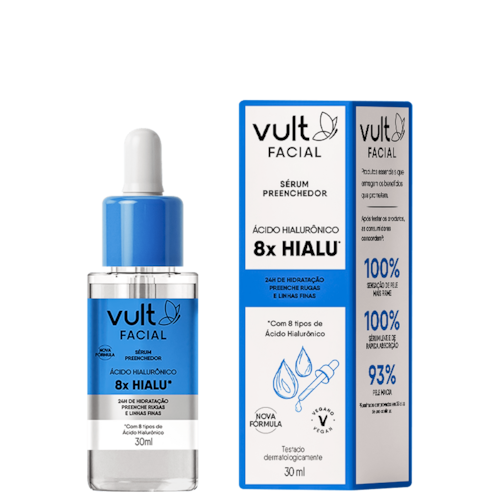 O Sérum Facial Vult Facial Ácido Hialurônico age em todas as camadas da pele graças à sua fórmula exclusiva, composta por 8 tipos de Ácido Hialurônico. Enquanto os ácidos de alto peso molecular agem na superfície, restaurando a hidratação e suavizando linhas de expressão, os de médio e baixo peso penetram profundamente, preenchendo rugas e recuperando o volume e a elasticidade. O resultado é uma pele com rugas e linhas de expressão reduzidas, além de firmeza, elasticidade e prevenção contra os sinais do envelhecimento.