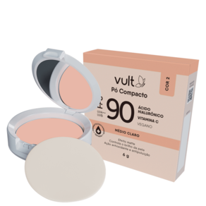 O Pó Compacto Facial Vult FPS 90 apresenta fórmula com ácido hialurônico, ação prebiótica e antioxidante, que uniformiza o tom da pele. O acabamento é leve e aveludado na pele, auxilia no controle do brilho facial ao longo do dia.